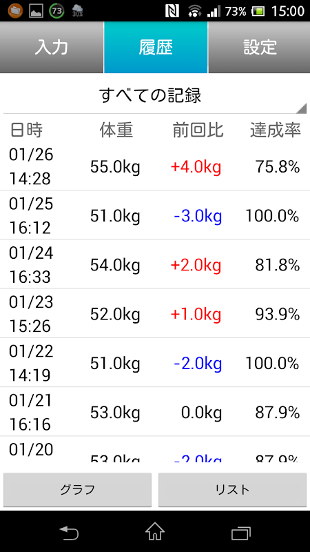 ◆グラフと一覧形式で過去の体重が確認できます。