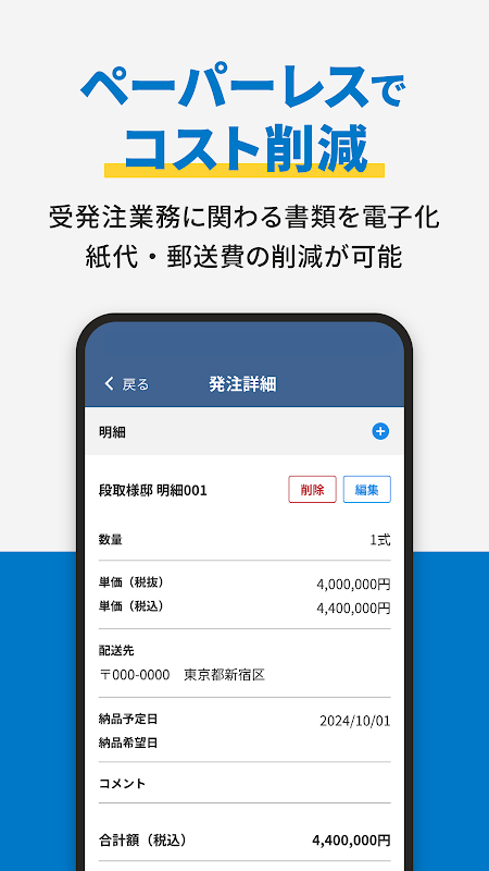 "Dandori Order -Ordering App-" è un'applicazione dedicata per eseguire lavori di commessa nei cantieri, collegandosi alle informazioni create in "Dandori Work -Site Management App-". Puoi visualizzare il processo di ordinazione, rispondere rapidamente alle attività di ordinazione mentre sei in movimento e ridurre i costi eliminando la carta.