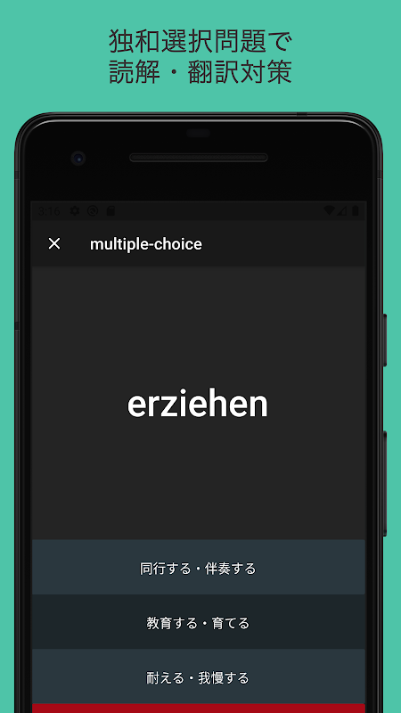 ドイツ人女性によるネイティブ音声を採用。暗記、選択、リスニング、ゲームモード、4機能搭載。約1500語を学習可能。独検2級〜準1級、国際試験B1〜C1に対応。