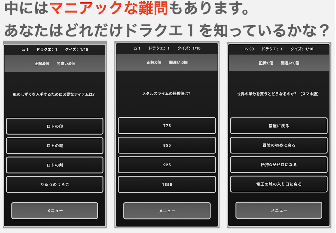 あなたはドラクエ1の博士になれるかな?ドラクエ1に関する問題を60問以上収録しています。