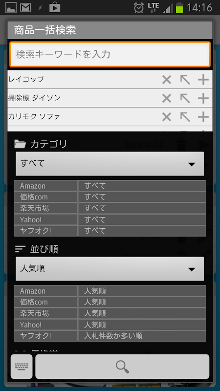 Amazon、価格.com、楽天市場、楽天オークション、Yahoo!ショッピング、ヤフオク!、セブンネットを1つのキーワードで一括検索します。