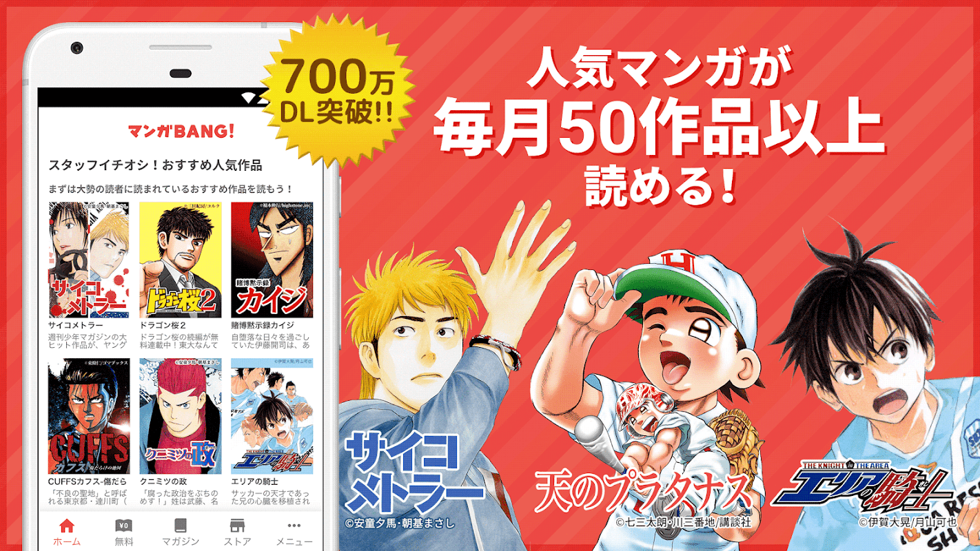 700万DLの人気漫画アプリ「マンガBANG」は無料で全巻読み放題。Dreams、サイコメトラー、東京闇虫、賭博黙示録カイジ等の人気漫画1,000冊超を配信中!