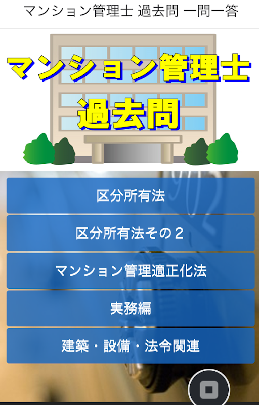 マンション管理のエキスパート資格であるマンション管理士の過去問を厳選し、一問一答式のクイズ形式にしました。出題が大半となる区分所有法、マン管法、標準管理規約、標準委託契約建築設備・法令を中心編集しています。一問一答式でスマホで効率的に学習可能です。