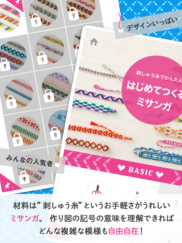 Una volta apprese le basi, acquisito familiarità con la gestione dei fili da ricamo e capito come legarli, sarai in grado di creare la tua Misanga originale cambiando il colore e il design dei fili. "Embroidery Thread Misanga", "Message Misanga" e "Beads and Embroidery Thread Misanga" mostrano come realizzare misanga più avanzati come lettere, piccoli motivi floreali, motivi a cuore e perline incorporate.