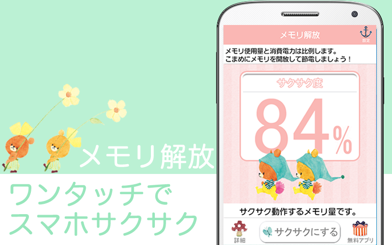 重くなったスマホのメモリを解放してサクサクに!ルルロロがスマホ最適化のお手伝いをします!こまめにメモリ解放すれば節電効果もあるよ!!