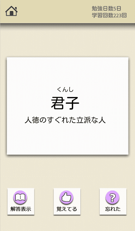 「忘れた」問題は何度も出題され、「覚えてる」を選択すると間隔を空けながら再度出題されます。