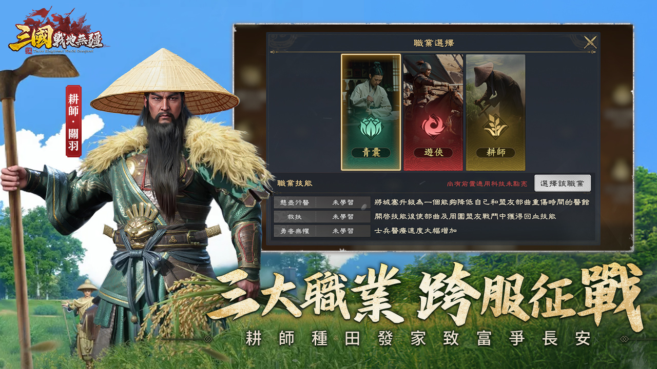 Vivendo i tempi caotici dei Tre Regni, potrete interpretare il ruolo di un ranger che combatte sul campo di battaglia, di un Qingnang che salva il mondo, di un contadino che sviluppa l'agricoltura e di altre professioni. La cooperazione tra diverse professioni è la chiave per la vittoria sul campo di battaglia. Diverse competenze professionali possono influenzare notevolmente tattiche e situazioni. Potete collaborare con i vostri alleati per svolgere i vostri compiti, utilizzare una meravigliosa combinazione di strategie professionali, collaborare per pianificare il mondo, vivere un'esperienza di gioco SLG completamente diversa e scrivere la vostra storia dei Tre Regni.