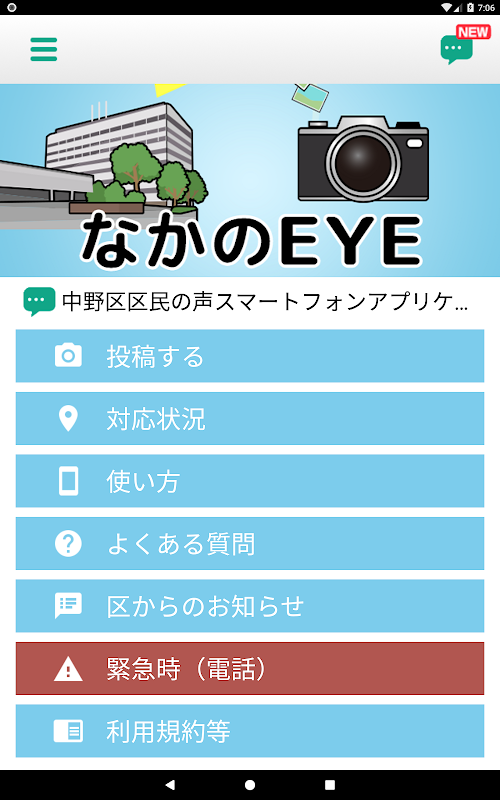 この度、当区では、区が管理する道路、公園、ごみ集積場等の施設の破損、不具合や、放置自転車への対応等、区の管理下にある地域の課題をスマートフォンのカメラ及びGPS機能を利用して区に投稿できる中野区区民の声スマートフォンアプリケーション「なかのEYE」をリリースしました。是非ご活用ください。