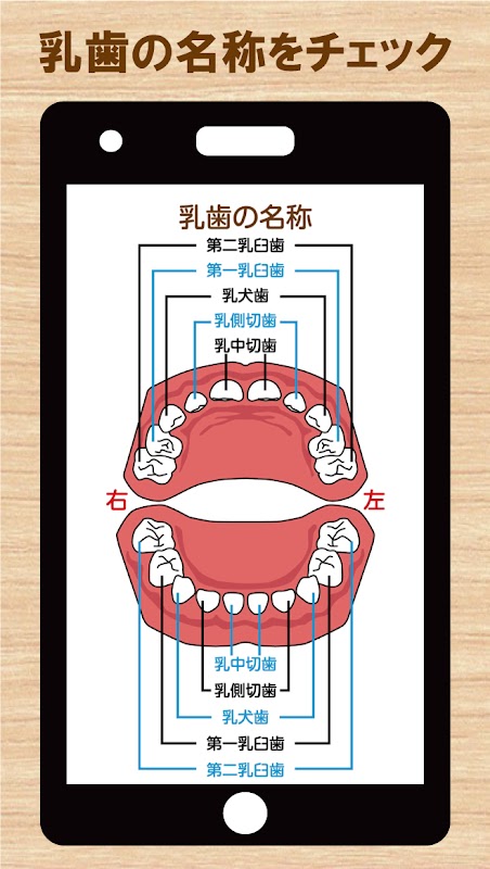 「乳歯おもいで箱」(乳歯ケース・アプリ)は乳歯の生え変わり時期や名称を確認できます。