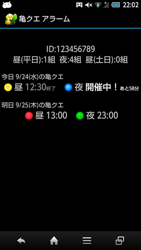ユーザIDの下2桁または全桁を入力することで、亀クエの時間をアラーム(画面)やステータスバー通知でお知らせしてくれます。