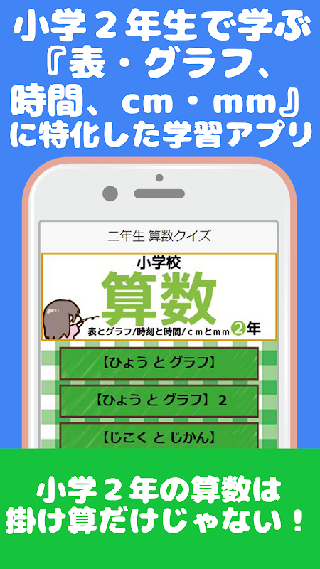 二年生で学ぶ算数の中で「表とグラフ/時刻と時間/cmとmm」をメインにしたクイズアプリです。やさしく簡単クイズから、応用クイズなど、遊んで学ぶ学習アプリです。