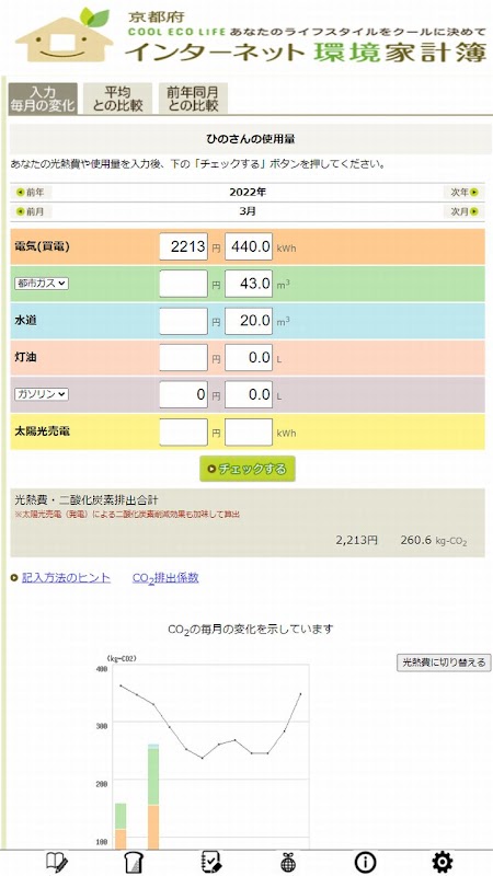 Inserendo la quantità di elettricità e gas utilizzata nella tua abitazione, puoi facilmente cogliere la quantità di anidride carbonica emessa dalla tua abitazione e confrontarla e valutarla con il valore medio delle normali famiglie.