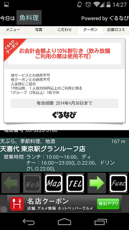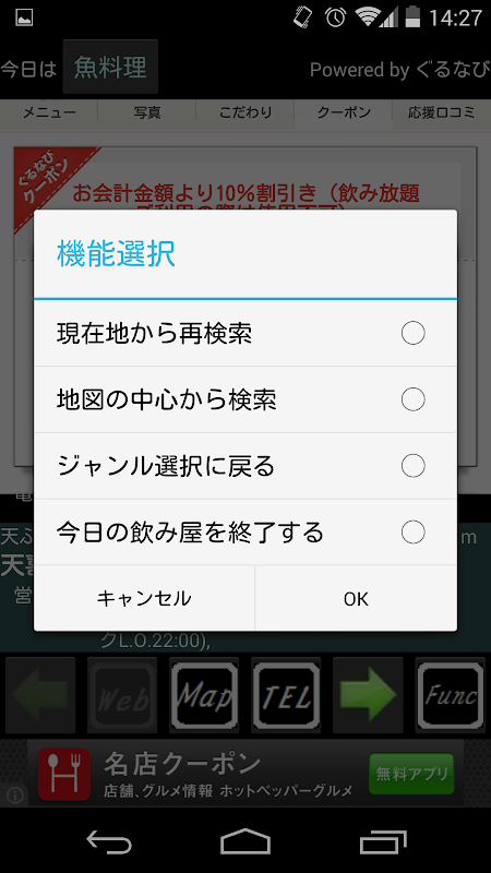 ・ヒットした店舗のぐるなびホームページ・クーポンを表示する