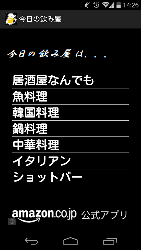 現在地付近の居酒屋をワンタッチで検索できるアプリです。これからどこの店に行こう?と思ったときにサッと使えます。ジャンル毎の検索も可能です。