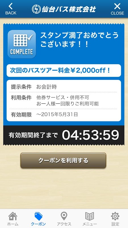 このアプリを通じて皆様に【感動】と【思い出】を提供致します。、仙台発着 日帰りバスツアー「仙台バス」の色々な情報やアプリユーザー限定のお得なサービスが手に入ります!