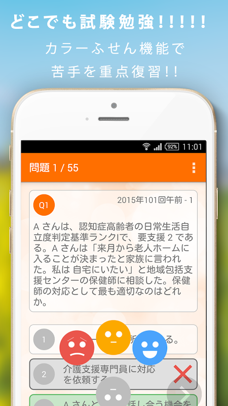 保健師の暗記カード+過去問 解説付。マイ暗記カードの作成、開催別、分野別、苦手な問題などから独自の問題セットを作成でき重要な項目を徹底的に復習できます。