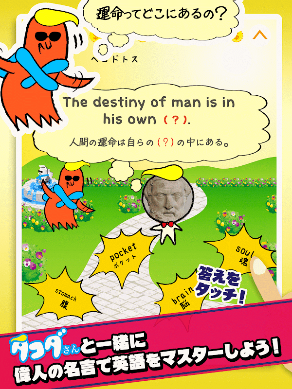 このアプリでは「タコダさん」の疑問や質問に対し、偉人たちが名言をアドバイスするという形式をとります。英語と日本語のやりとりで前に進み、隠されている名言のキーとなる英単語を4択の答えの中から選んでいきます。