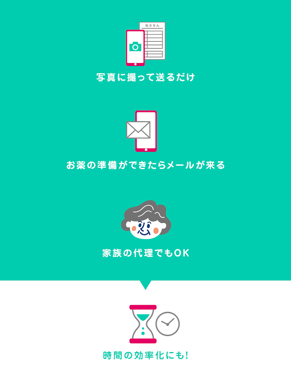 病院で受け取った処方せんをアプリから撮影して薬局へ訪れる前に送信することで薬局で待つ必要がなくなります。お薬の準備ができたらアプリとメールでお知らせするので空いた時間を有効活用できます。