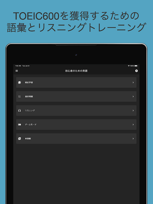 このアプリは英語初心者、主に入門・基礎レベルのTOEIC受験者が600点を獲得するために必要な「語彙力」「リスニング力」を鍛えるための学習アプリです。