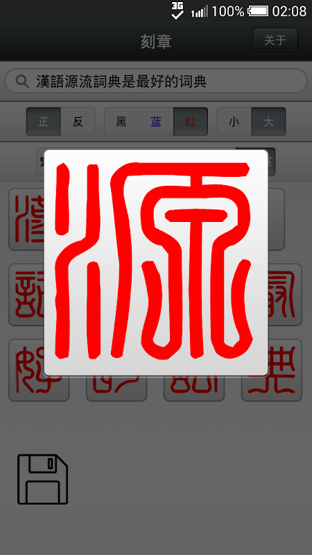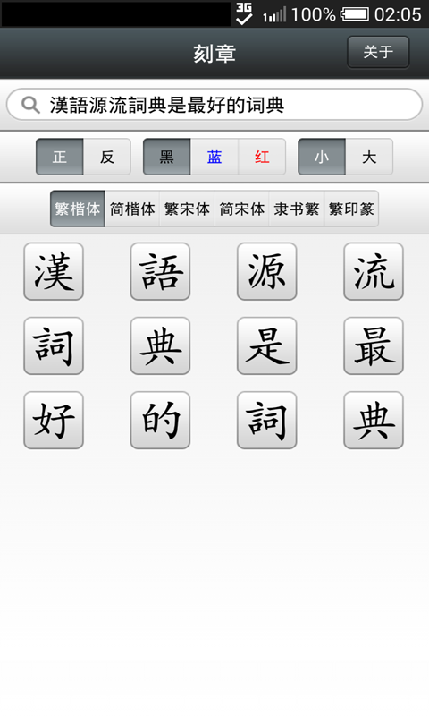 此app用于刻章、刻字、练习书法之用。支持繁体、简体字查询。支持的字体有:繁楷体、简楷体、繁宋体 、简宋体、隶书繁、繁印篆共6种。