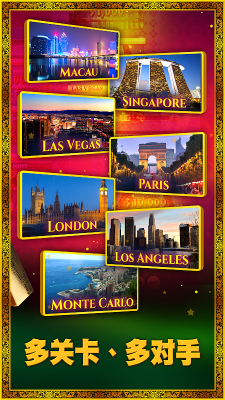 游戏中设有多个等级场景,包括澳门、新加坡、拉斯维加斯、巴黎和伦敦。在不同的场景你会遇到不同的对手。你必须击败其他电脑对手来提升你的排名。我们有无限免费筹码,当你的余额少于$3,000时,我们会免费为你增加至$3,000,不限次数,真正无限免费。