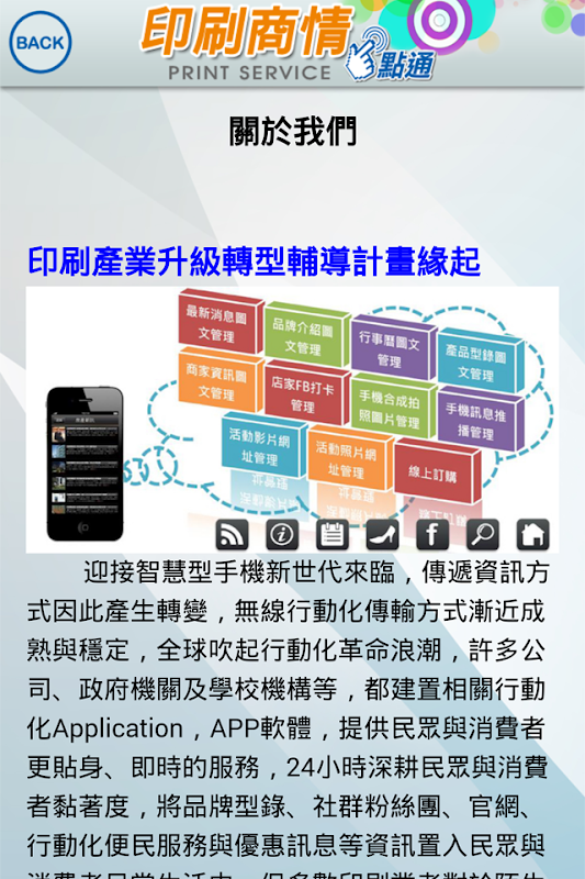台灣印刷業在創新科技領域與創新服務模式推展略顯不足,透過APP來推播印刷產業相關商情資料及推廣台灣印刷業創新發展成果,打造出創新服務模式達到創新商機媒合的契機。