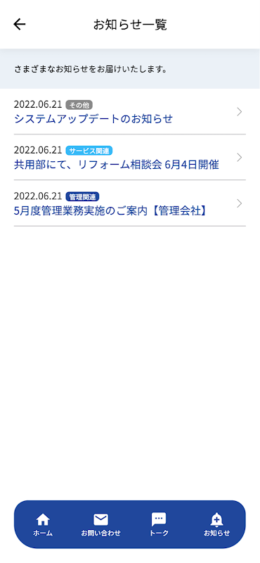 Dall'app puoi visualizzare i dati necessari come regole e rapporti per ogni condominio, vari documenti di domanda e manuali di istruzioni.