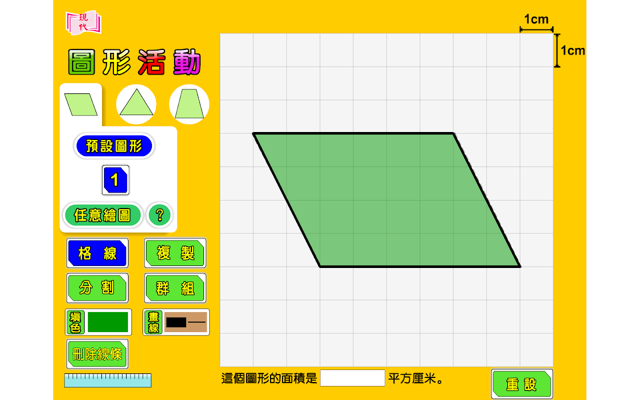 學生可於方格內建構不同平面圖形,配合多種功能如複製、分割、群組等,讓學生探究出不同圖形的面積的計算方法。