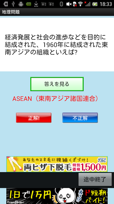 Le domande sono "Asia orientale", "Oceania", "Europa", "Nord America", "Il clima del mondo e del Giappone", "Industria, industria ed economia del Giappone" ", "Agricoltura, silvicoltura e pesca del Giappone", "Geografia in generale" e "Geografia". Sono presenti 22 campi come "Trivia".