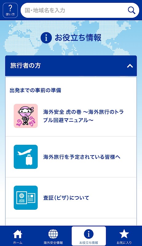 La "Overseas Safety App" è un'app ufficiale del Ministero degli Affari Esteri per fornire informazioni relative alla sicurezza a coloro che vivono all'estero o sono in viaggio o in viaggio d'affari all'estero.