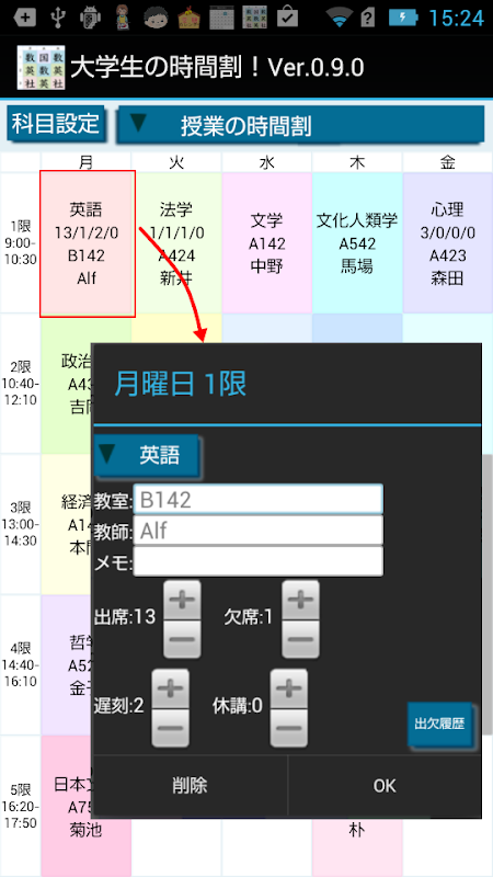 大学生が使うことを想定し、出欠のカウント機能を入れた時間割表アプリです。