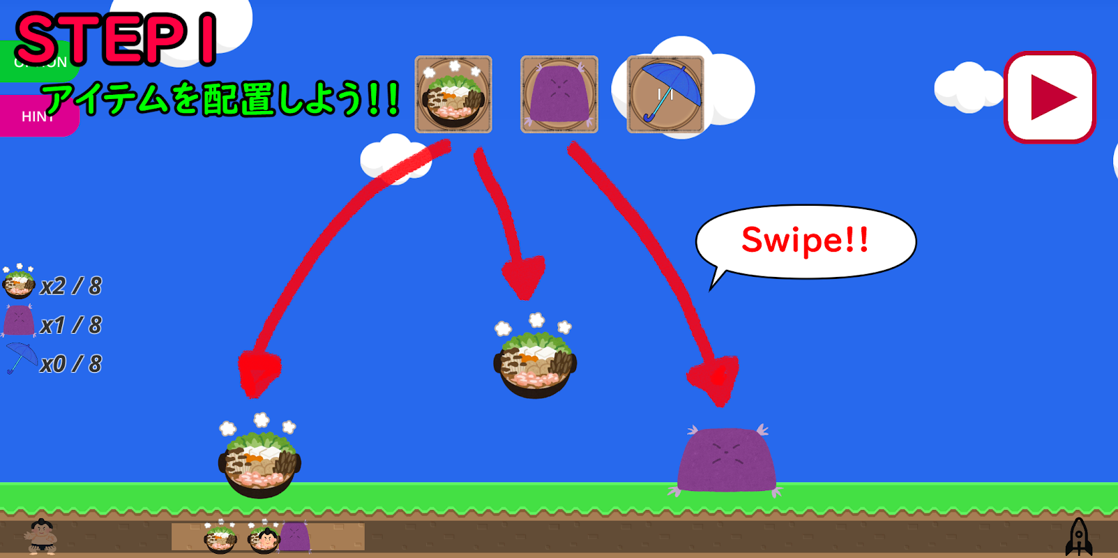アイテムをスワイプで配置して、準備ができたらスタートボタンを押すだけ。