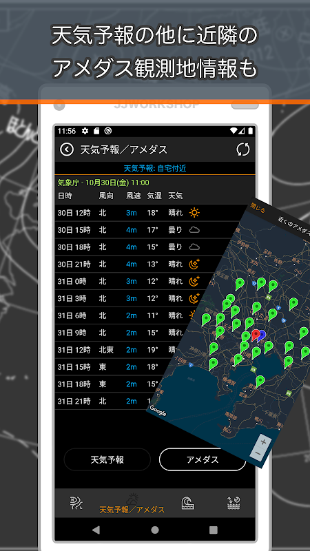 "Meteo, vento e onde" utilizza i dati pubblici rilasciati dall'Agenzia meteorologica giapponese e consente di controllare mappe meteorologiche, previsioni meteorologiche, informazioni sui venti e sulle onde costiere e oceaniche aperte, grafici delle maree, ecc.