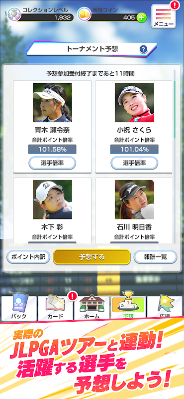 raccogliere! supporto! Il golf professionistico femminile diventa più divertente! Un gioco di carte con giocatrici di golf professioniste appartenenti alla JLPGA è finalmente arrivato! Colleziona le carte dei giocatori e sostieni il golf professionistico femminile!