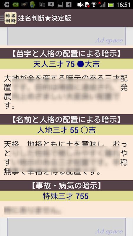 È un'app di valutazione del nome e della fortuna a tutti gli effetti e altamente accurata basata sul nome e sullo studio del nome di Keno Kumazaki, che è l'origine del giudizio sul nome. È dedicato alla semplice funzione di valutare la fortuna del nome che inserisci e puoi facilmente controllare e conoscere la fortuna di te stesso e delle persone intorno a te e le variazioni di fortuna dovute a un cambio di nome. Oltre ad essere dotato di una funzione di registrazione della cronologia degli input utile quando si nomina un bambino, è anche facile utilizzare la funzione di condivisione per inviare i risultati della valutazione ad amici e conoscenti o per pubblicarli su SNS.