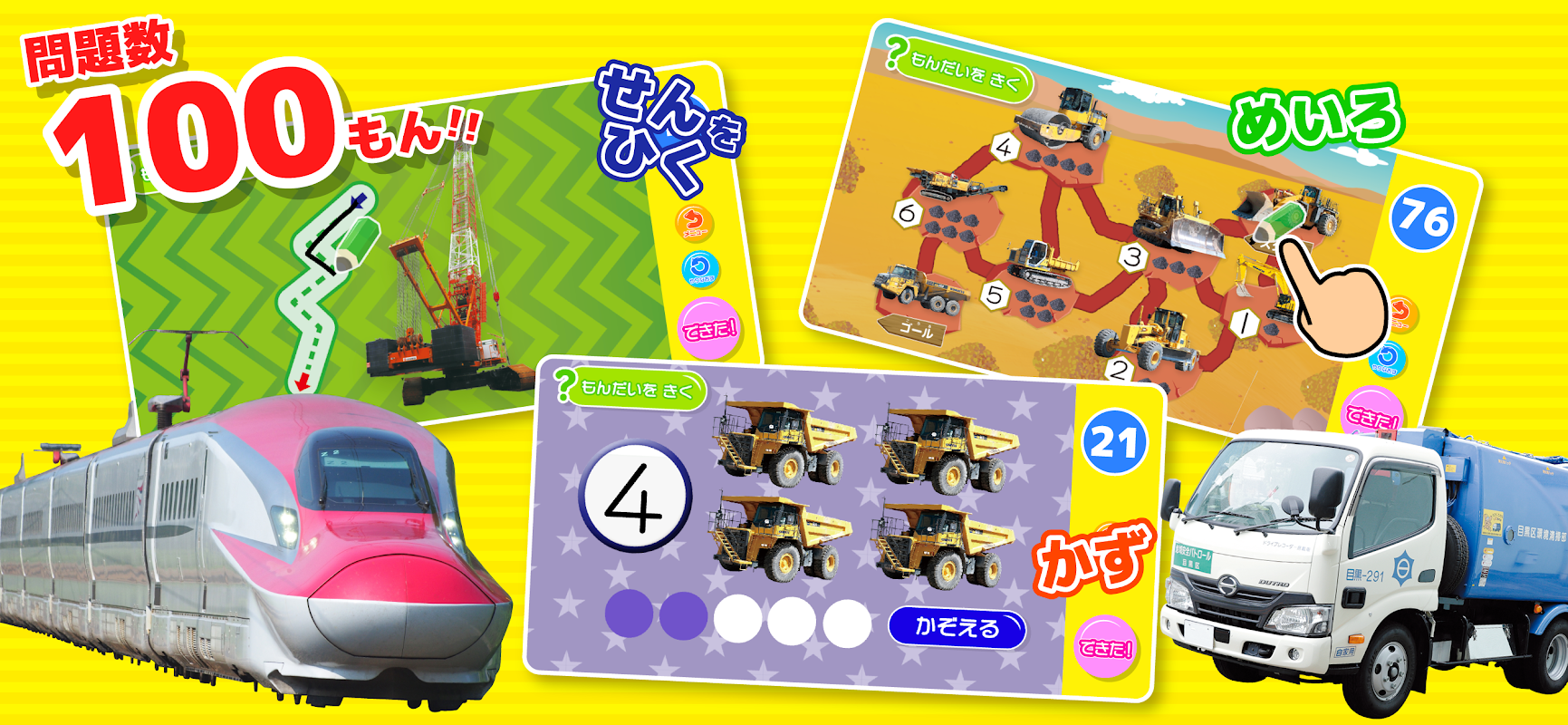 Puoi divertirti imparando l'hiragana, il kazu, l'inglese, come leggere l'orologio, ecc. insieme alle immagini dei vari veicoli. Ci sono molti problemi che puoi imparare mentre giochi, come labirinti e giochi di adesivi.