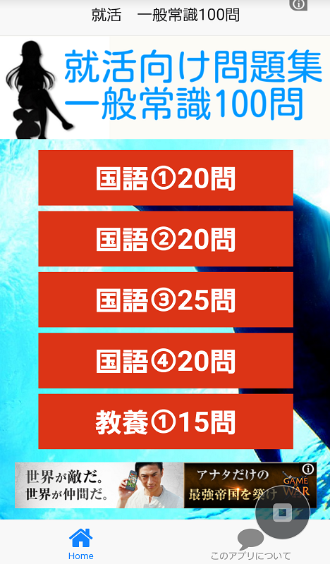 このアプリは就職活動などの一般常識とよばれる筆記試験問題を題材にした無料練習アプリです。主に文系学生向けに、国語と教養をメインに問題集を作成しました。