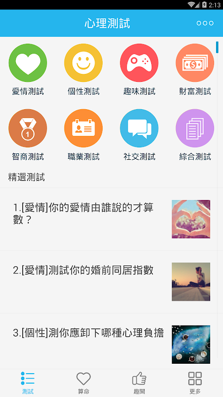 【测试区】测试区包括爱情测试,个性测试,趣味测试,财富测试,职业测试,社交测试,智商测试,综合测试八大模块。