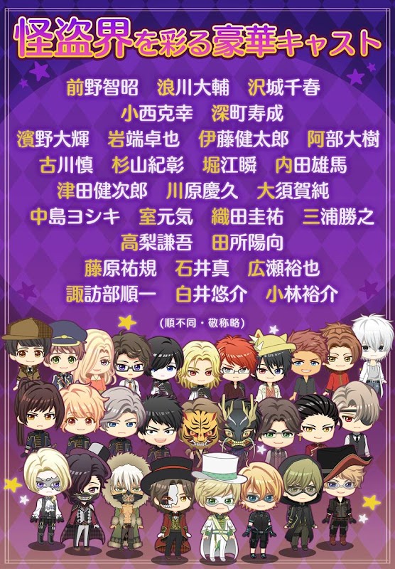 Daiki Abe, Makoto Ishii, Kentaro Ito, Takuya Iwabata, Yuma Uchida, Jun Osuka, Keisuke Oda, Yoshihisa Kawahara, Katsuyuki Konishi, Yusuke Kobayashi, Chiharu Sawashiro, Yusuke Shirai, Noriaki Sugiyama, Junichi Suwabe, Yomu Taka, Kengo Taka , Yoshiki Nakajima, Daisuke Namikawa, Daiki Hamano, Yuya Hirose, Toshinari Fukamachi, Yuki Fujiwara, Makoto Furukawa, Shun Horie, Tomoaki Maeno, Katsuyuki Miura, Genki Muro