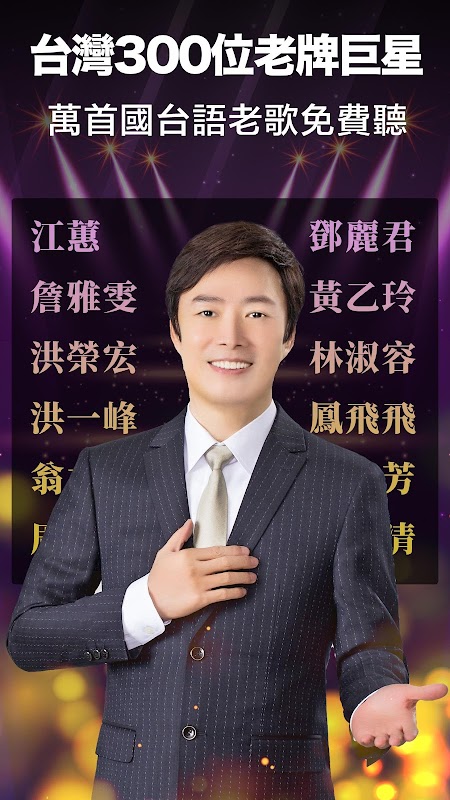 費玉清、鄧麗君、江蕙、詹雅雯、劉文正、文夏、陳小雲、郭金發、林淑容...等等,老中青三代超過300位經典巨星歌手全部免費聽。