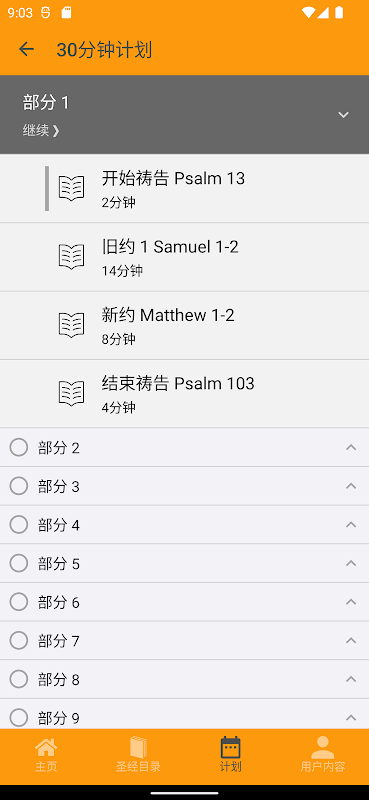 Il contenuto di ogni lettura include: due salmi come inizio e fine della preghiera, un brano dell'Antico Testamento e un brano del Nuovo Testamento. Se usi il piano di lettura della Bibbia di 45 minuti e 60 minuti, puoi leggere l'Antico Testamento una volta e il Nuovo Testamento due volte in due anni e mezzo.