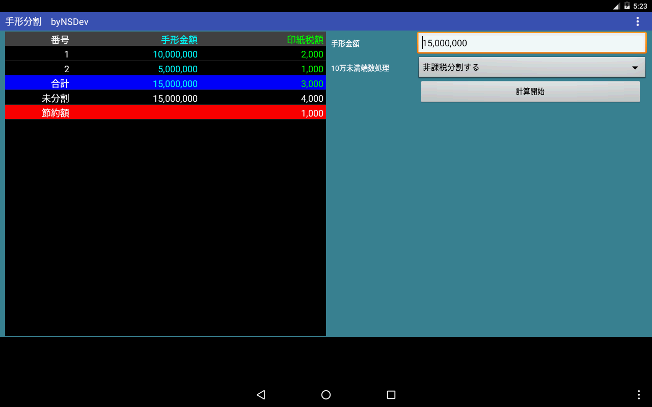 手形の印紙税を少しでも少なくするために手形をできる限り少ない枚数で効率よく分割するアプリです。