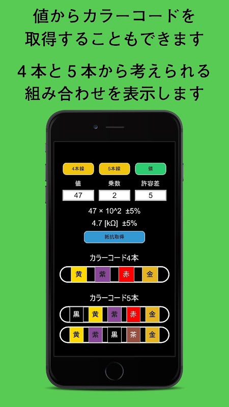 そんな場合も本アプリを使用すれば、抵抗値を入力するだけでカラーコードを知ることができます。