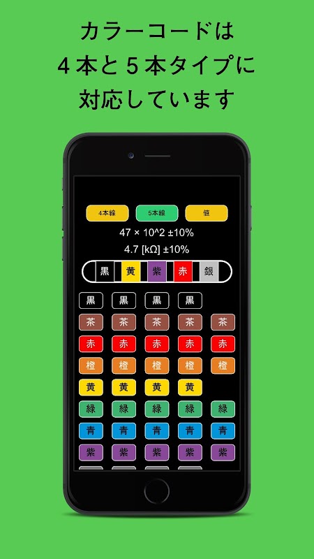 本アプリを使えば調べたい色をタップするだけで、その抵抗値を簡単に調べることができます。