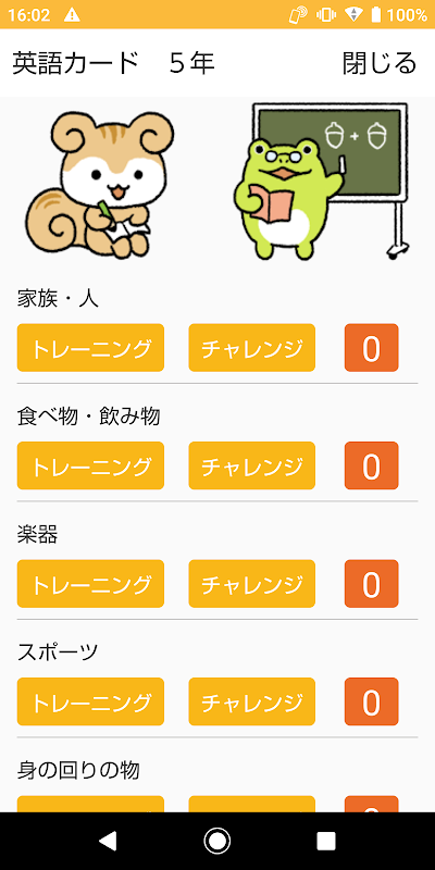 ●「たんご」と「かいわ」では,1つずつ練習する「トレーニング」と,まとめてテストする「チャレンジ」の2つのモードがあります。