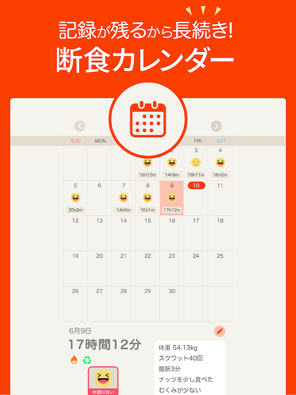 Pertanto, si prega di utilizzare il "timer del digiuno" che semplifica la gestione del tempo e della motivazione e il "calendario del digiuno" che rende facile continuare.
