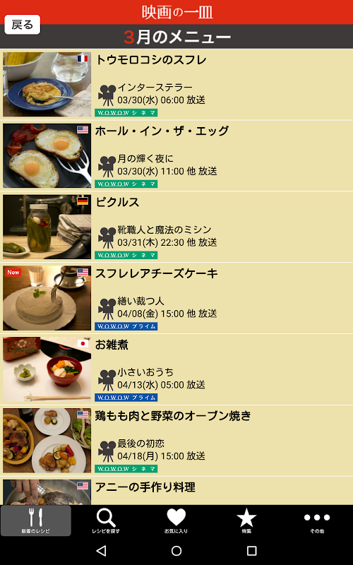 映画のタイトルや、たくさんの料理の種類の中から、180を超えるレシピを検索できます。