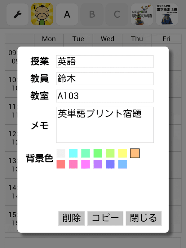 簡単に時間割が作成できる無料アプリ!背景設定自由で様々な時間割を作成可能!小学生から中学、高校、大学生まで、学校の時間割表の作成に是非ご利用ください。