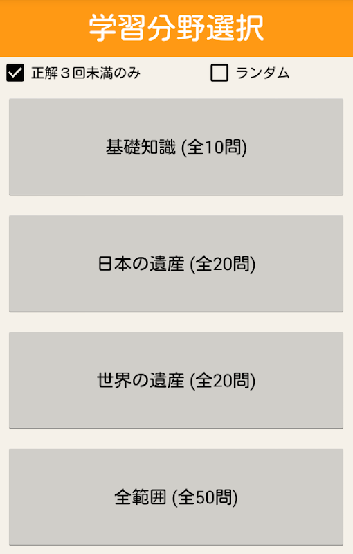 世界遺産検定は「基礎知識」および「日本の遺産」の出題比率が非常に高い一方で、世界の遺産の出題比率は低いという特徴があります。そこで、基礎遺産と日本の遺産に関しては問題数を多くしているので、試験に臨む前にはこの2つについてはアプリ内の問題を全部解けるようにしてください。