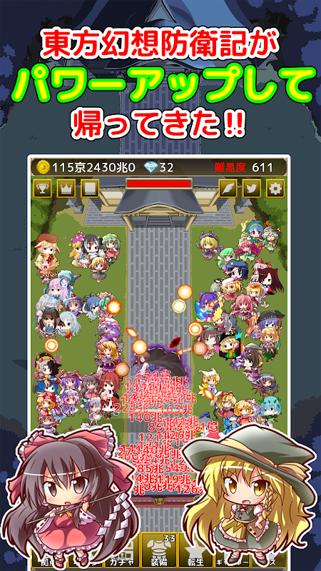 Touhou Gensou Bougeki è tornato e potenziato! Gli elementi di difesa e gli elementi dell'equipaggiamento sono aumentati, rendendolo più gratificante! Un gioco di difesa inattivo orientale in cui difendi Gensokyo con i personaggi Touhou!